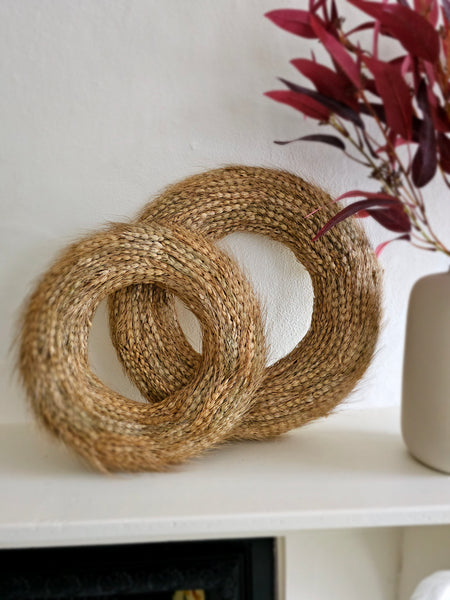 A beautiful, rustic dried wheat wreath. The perfect wreath to transition from late summer into Autumn. Due to the delicate nature of the dried florals, this wreath needs to be keep sheltered and dry.
