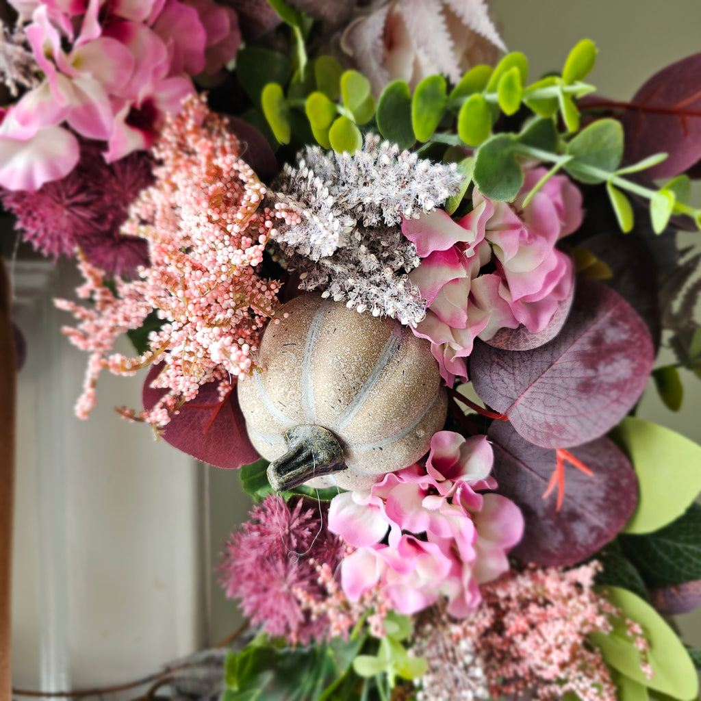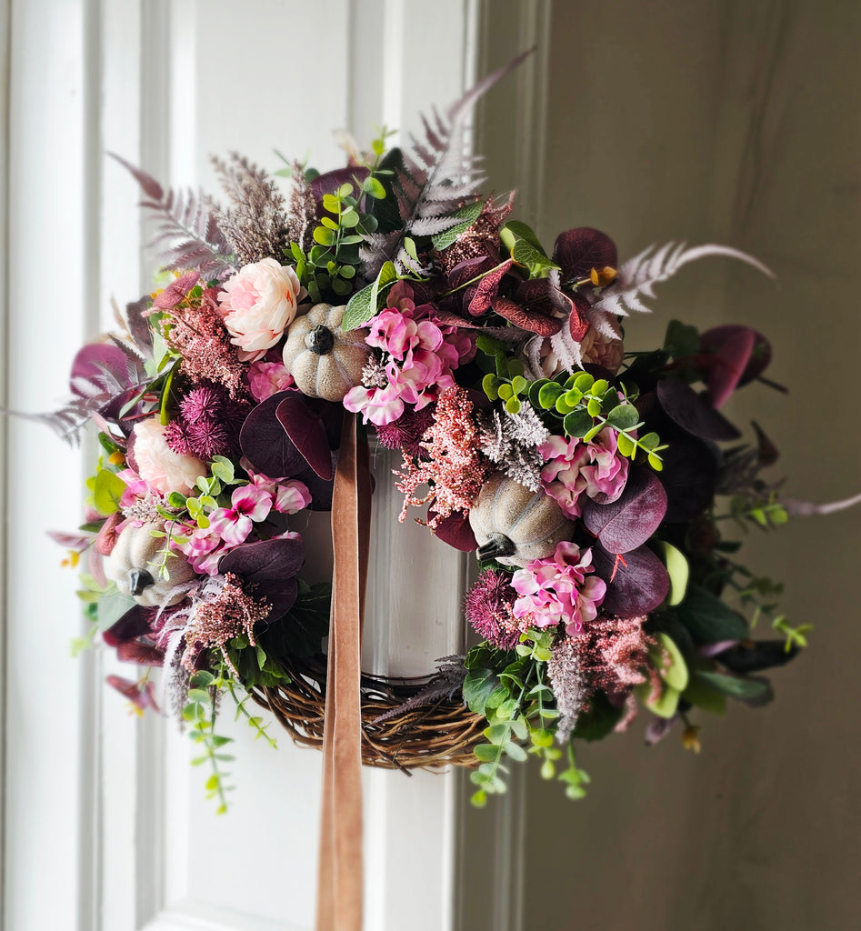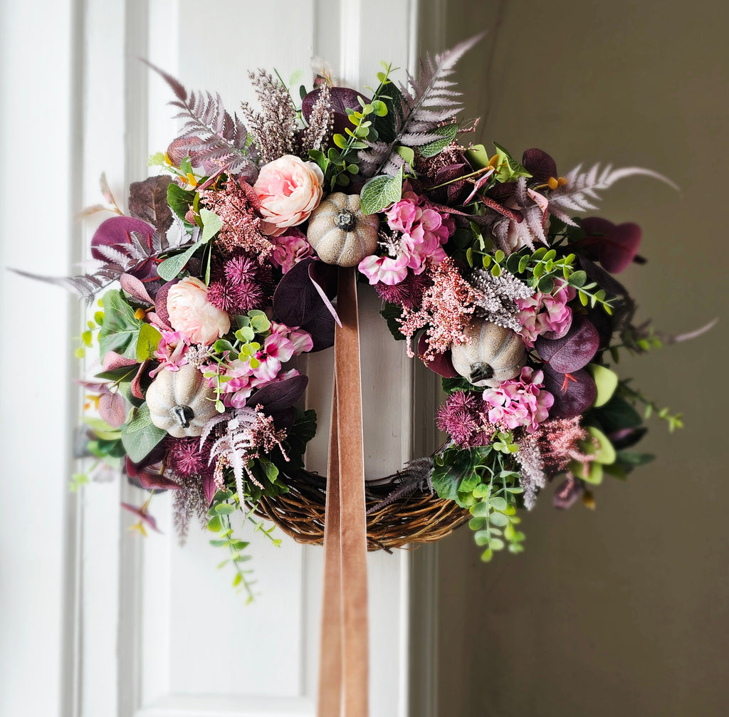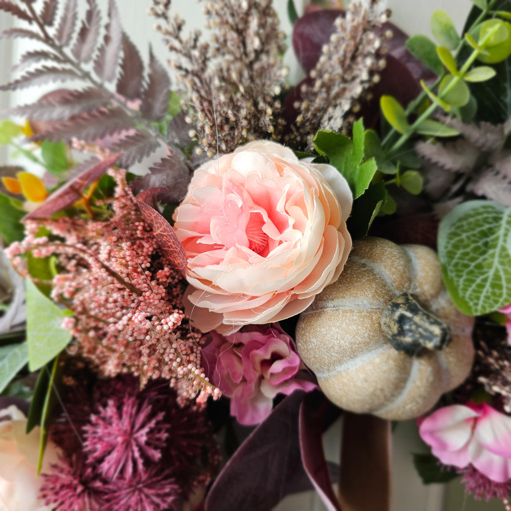 Lenora is a beautiful cresent wreath full of lush faux foliage and pumpkins finished with a velvet ribbon.