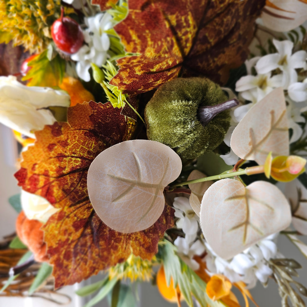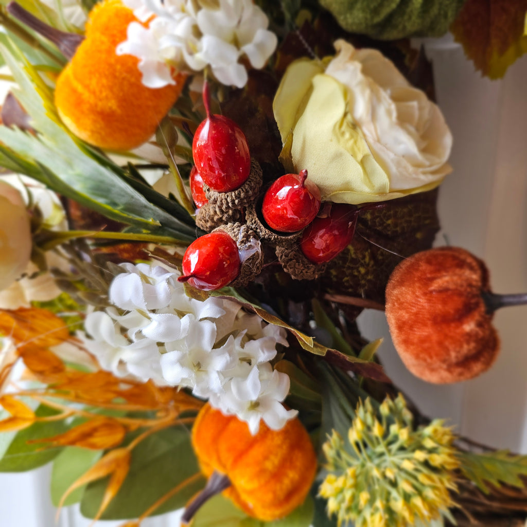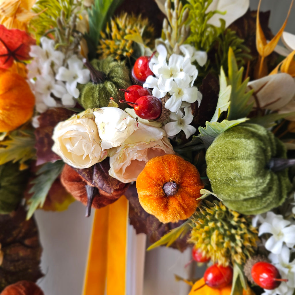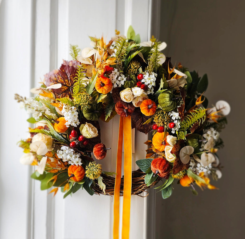 The Sienna wreath is a stunning cresent wreath full of velvet pumpkins surround by masses of faux Autumnal foliage and florals all finished off with a luxurious velvet ribbon.