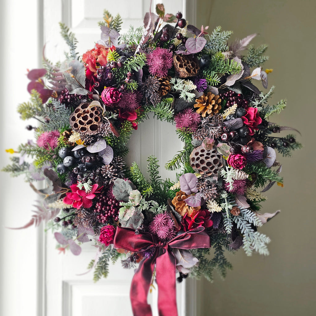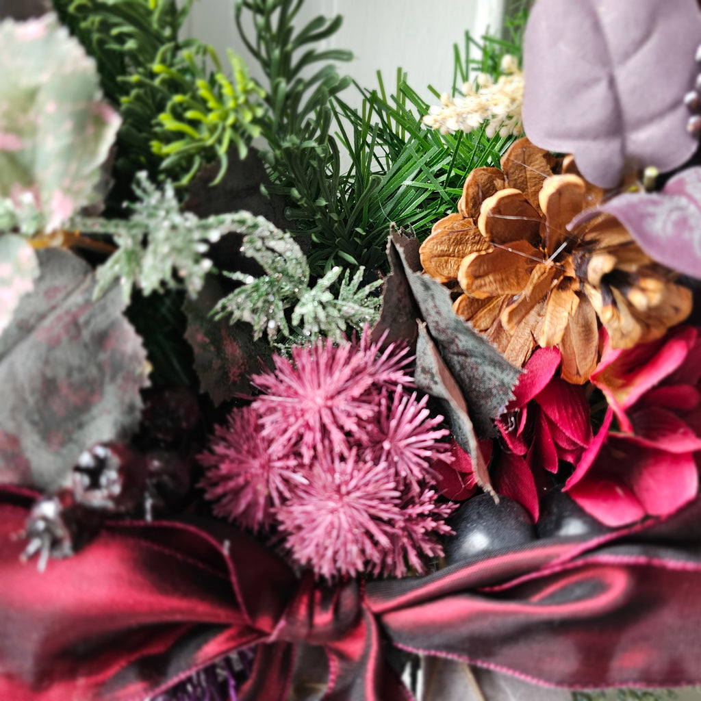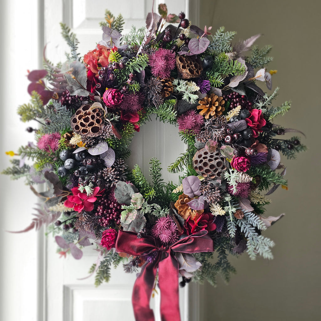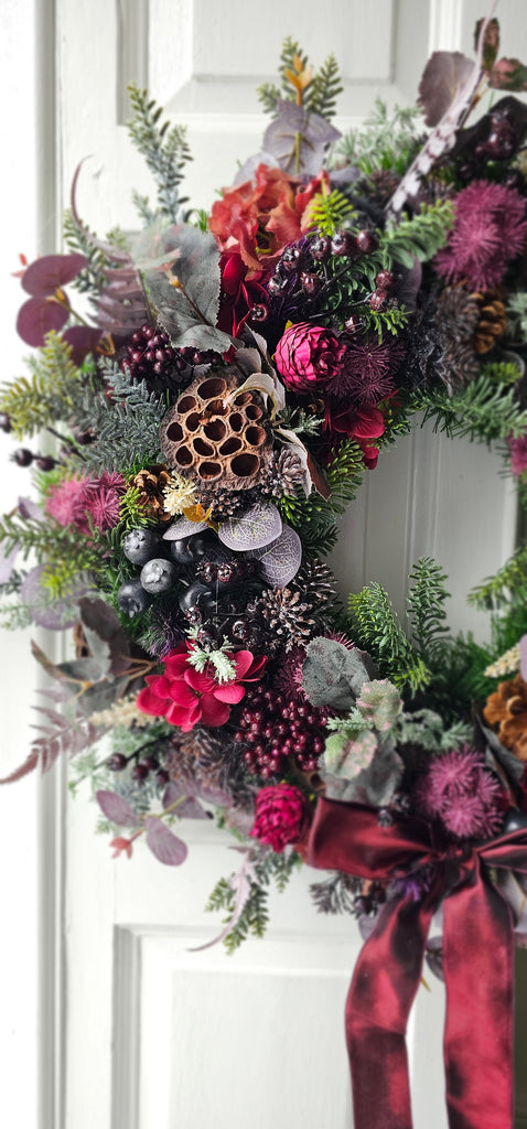 A stunning mix of faux winter foliage with pinecones, lotus pods and hydrangeas. Finished with a burgundy satin bow. Handcrafted, the foliage extends out to approx 60cm. Ready for dispatch this week.