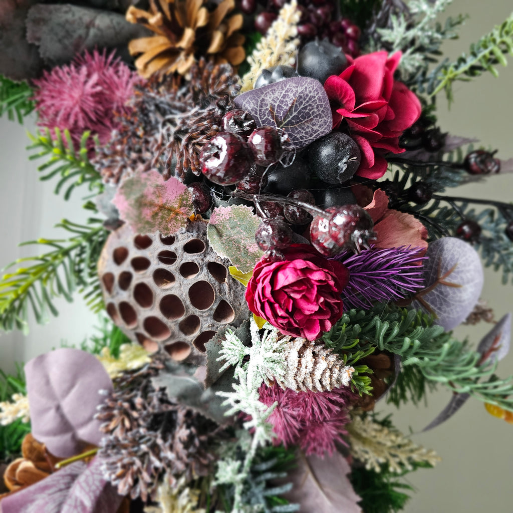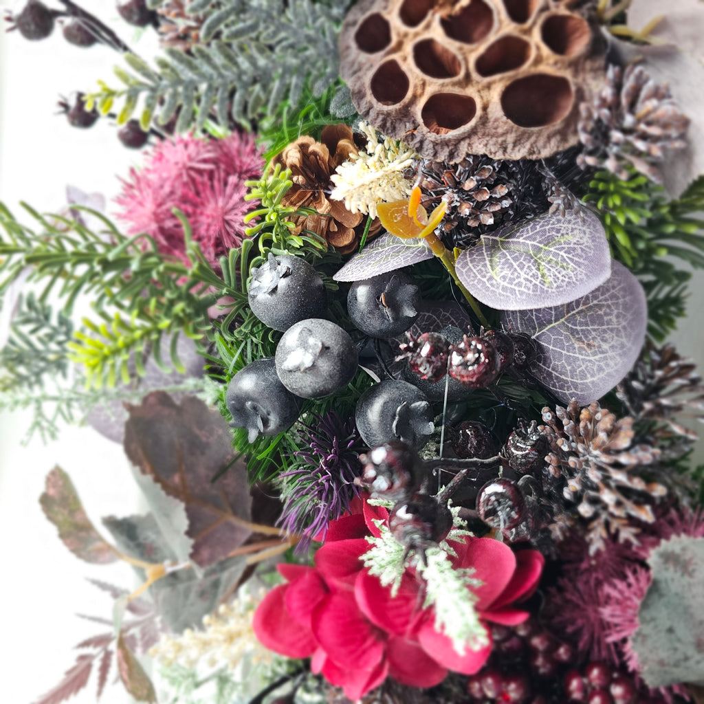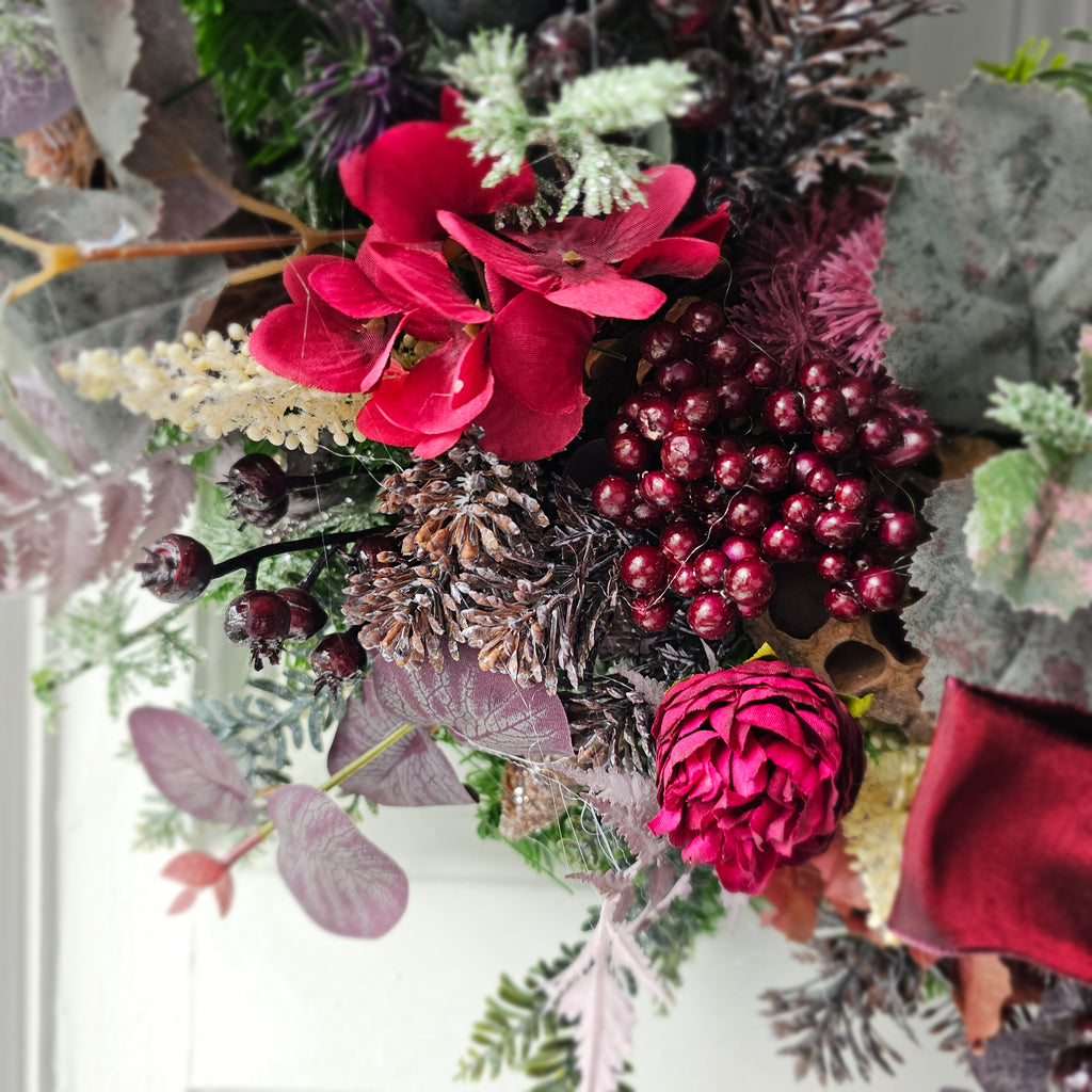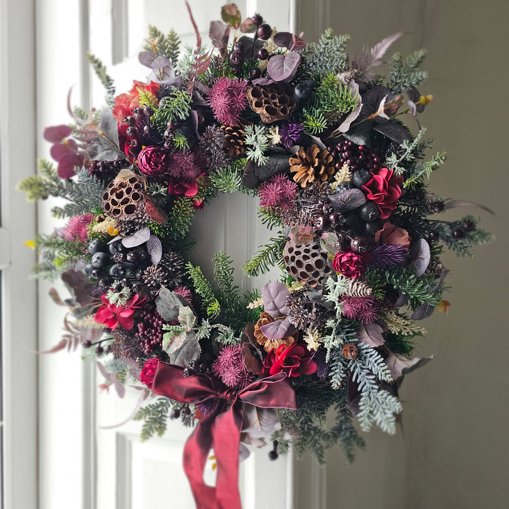 A stunning mix of faux winter foliage with pinecones, lotus pods and hydrangeas. Finished with a burgundy satin bow. Handcrafted, the foliage extends out to approx 60cm. Ready for dispatch this week.