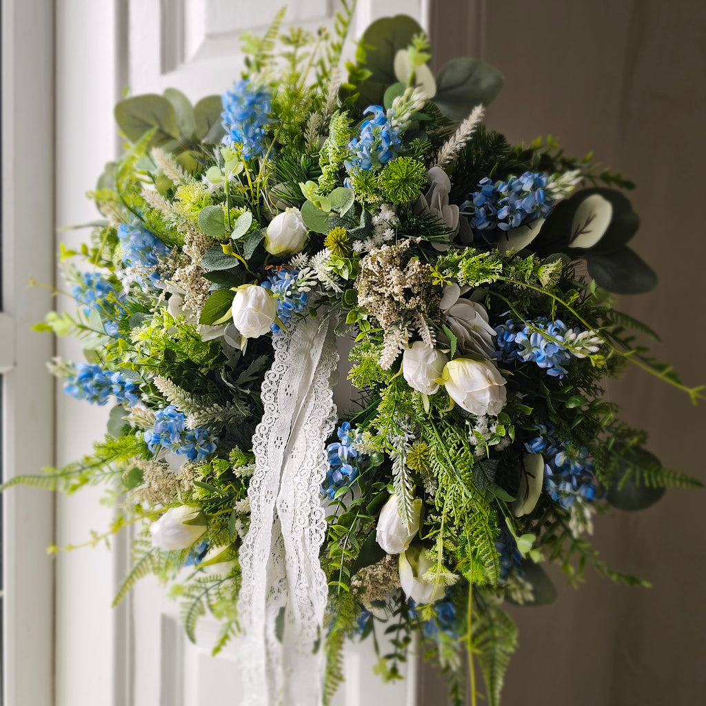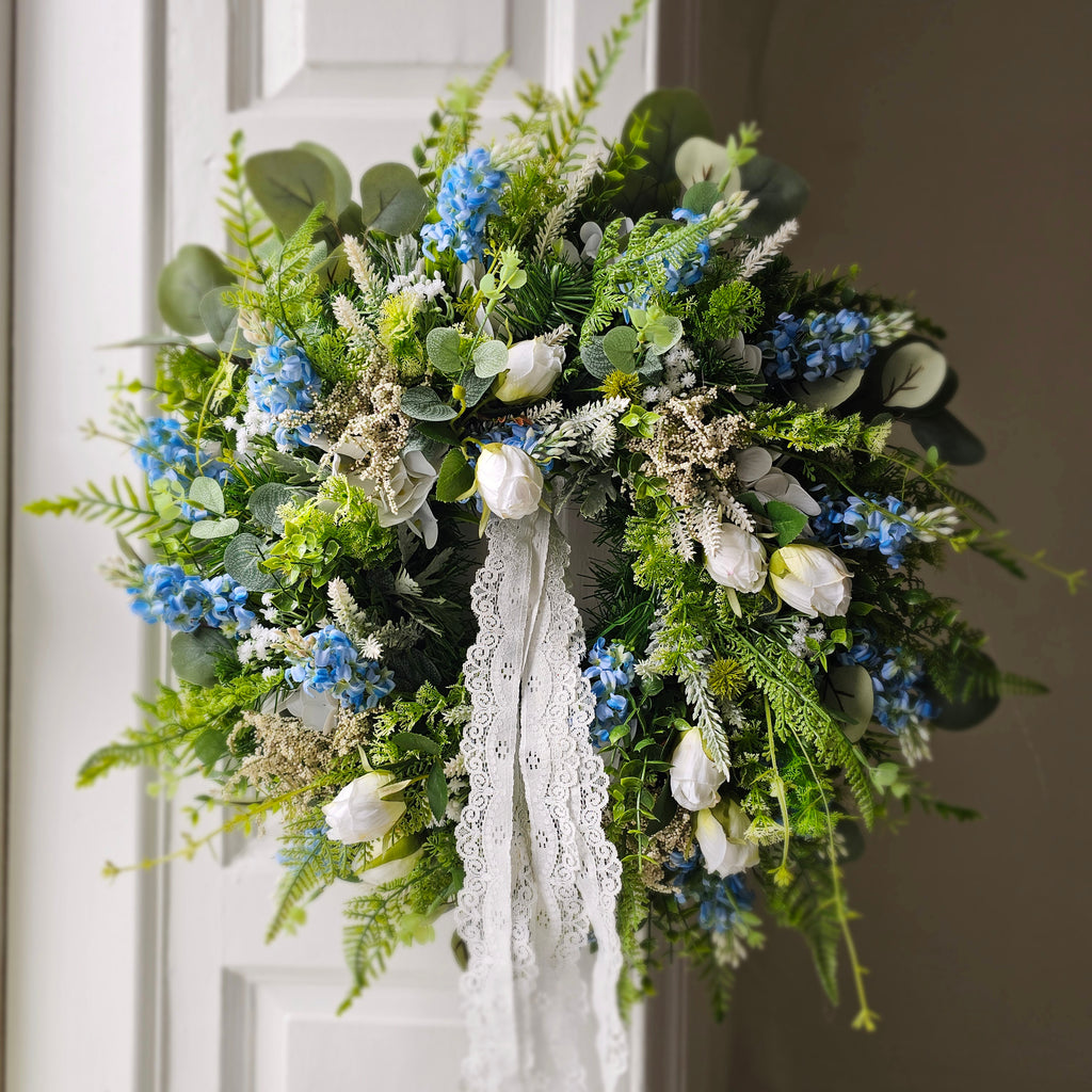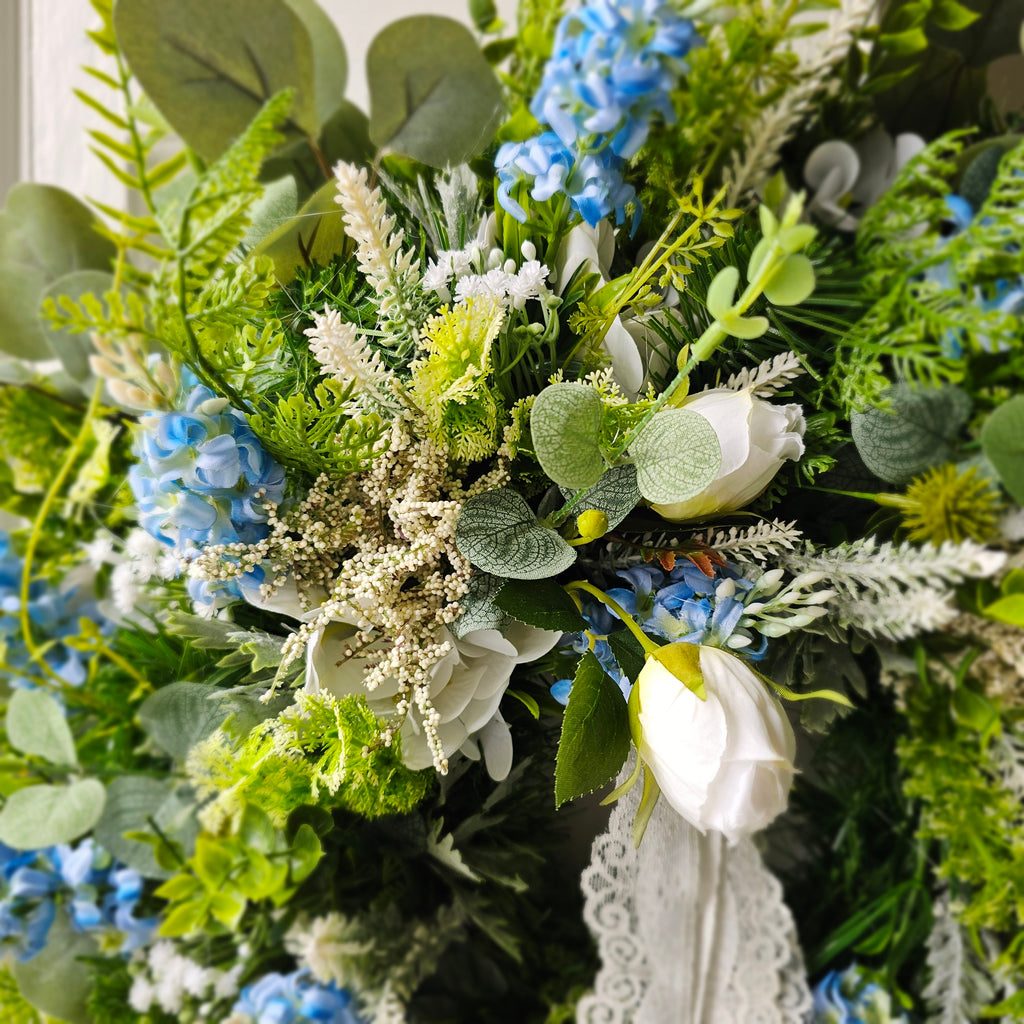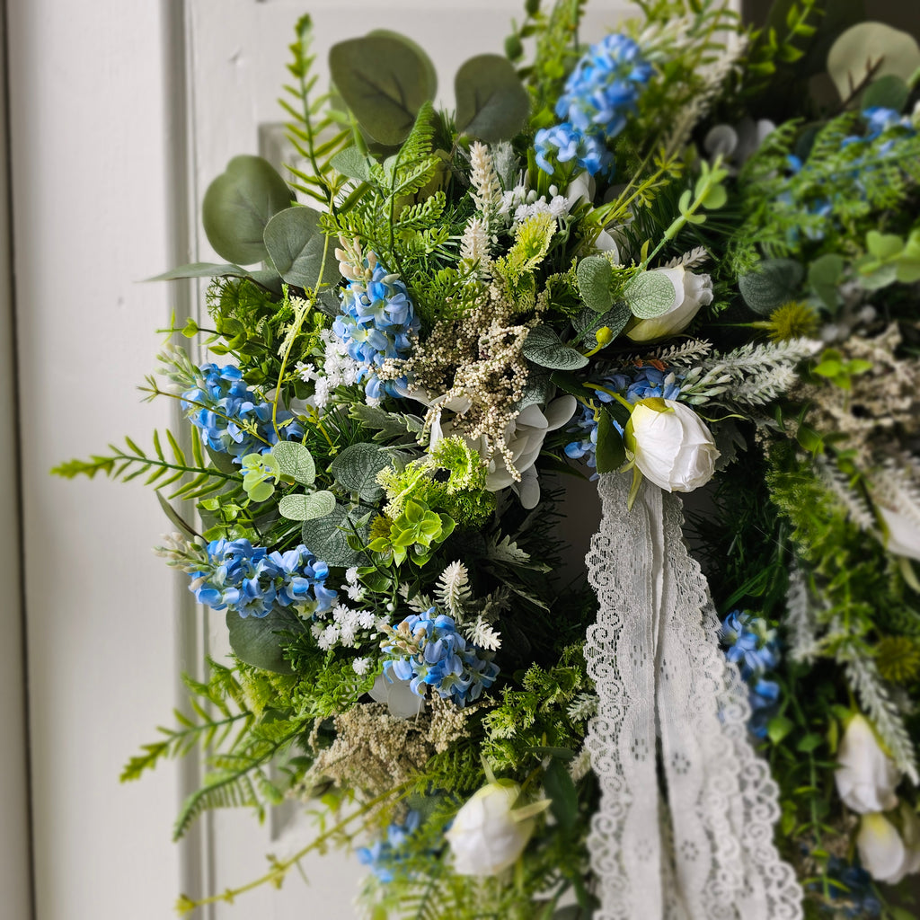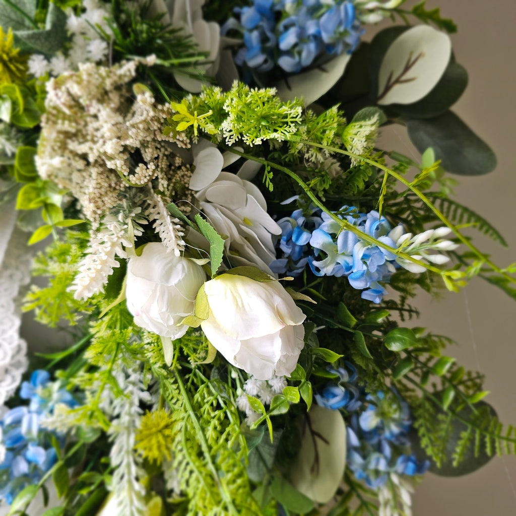 A stunning, delicate looking wreath full of faux florals and foliage finished with a delicate lace ribbon. Handcrafted, the foliage extends out to approx 55cm from tips.