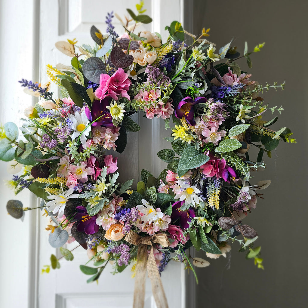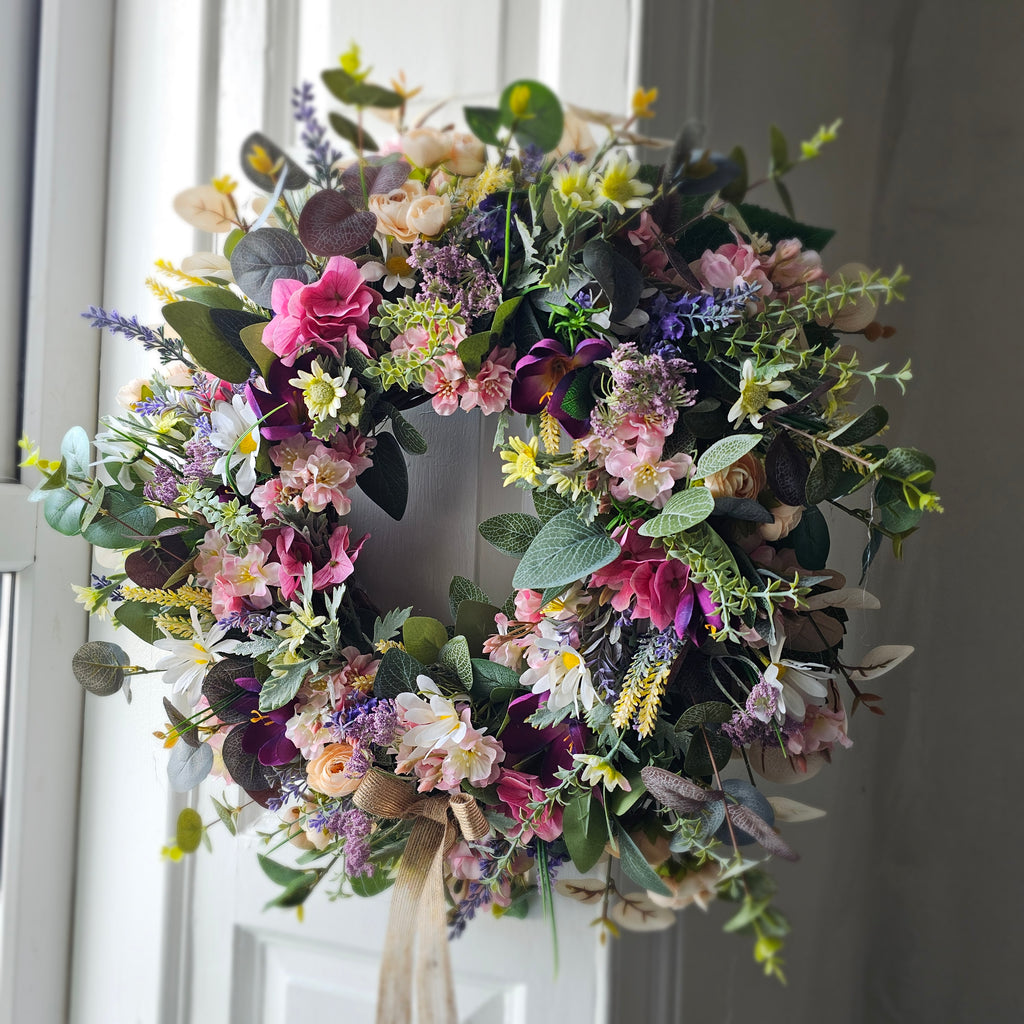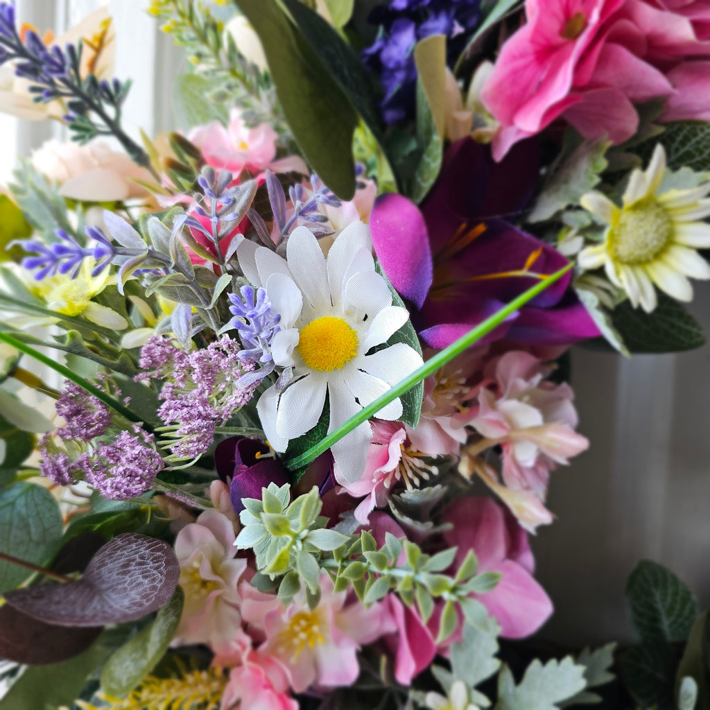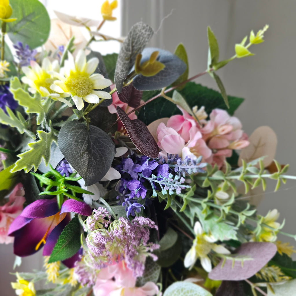 A beautiful gathering of faux florals and foliage. Handcrafted, the foliage extends out to approx 55cm.