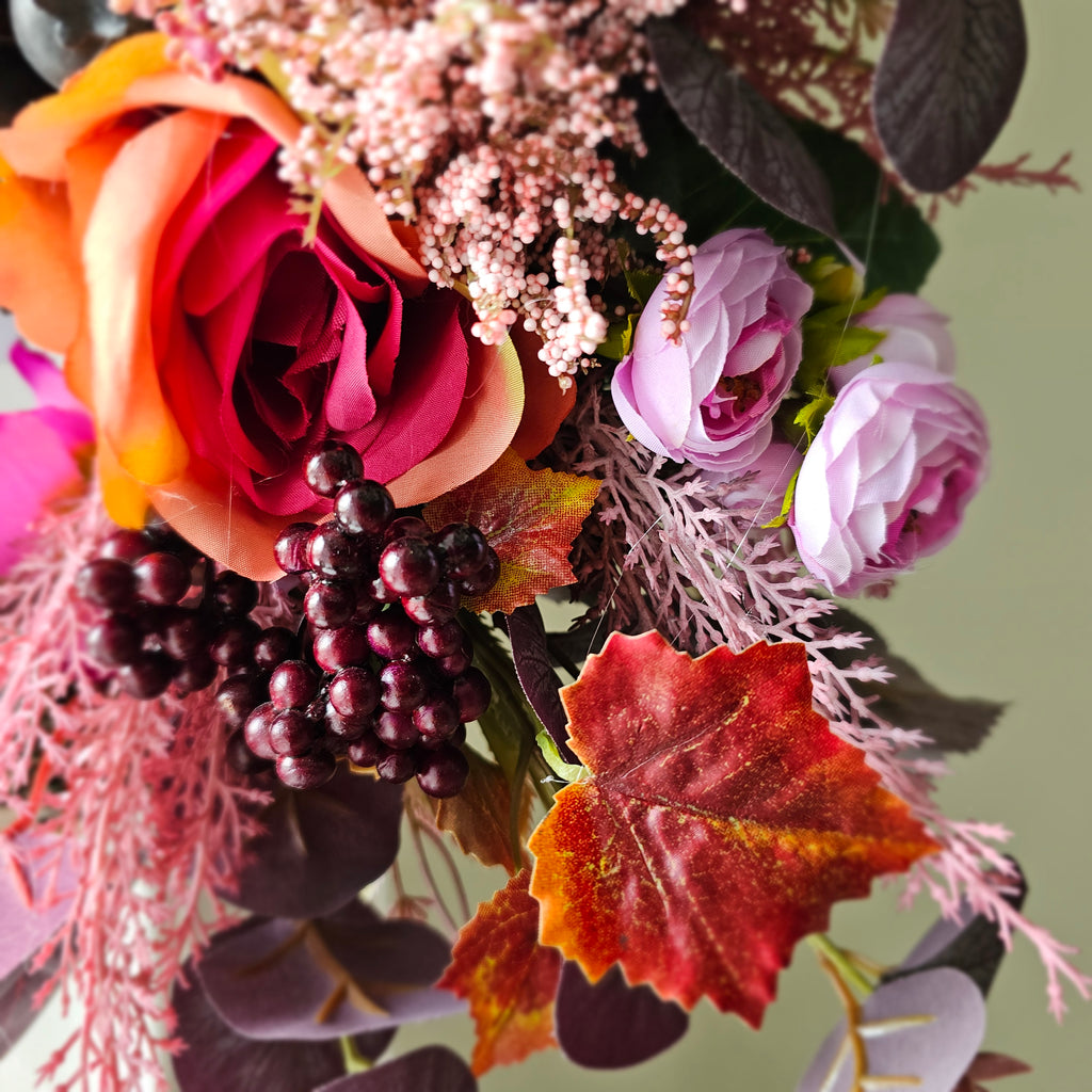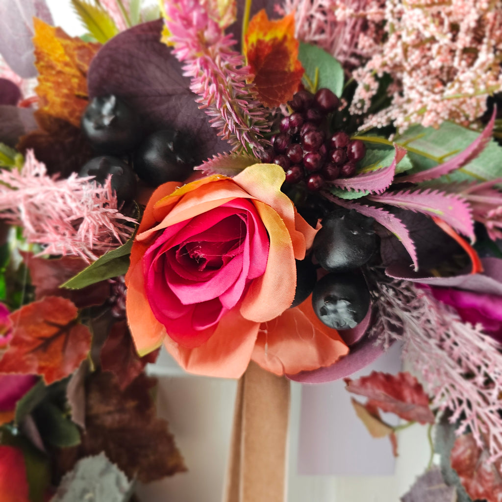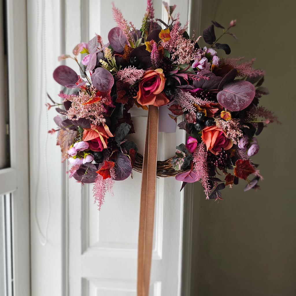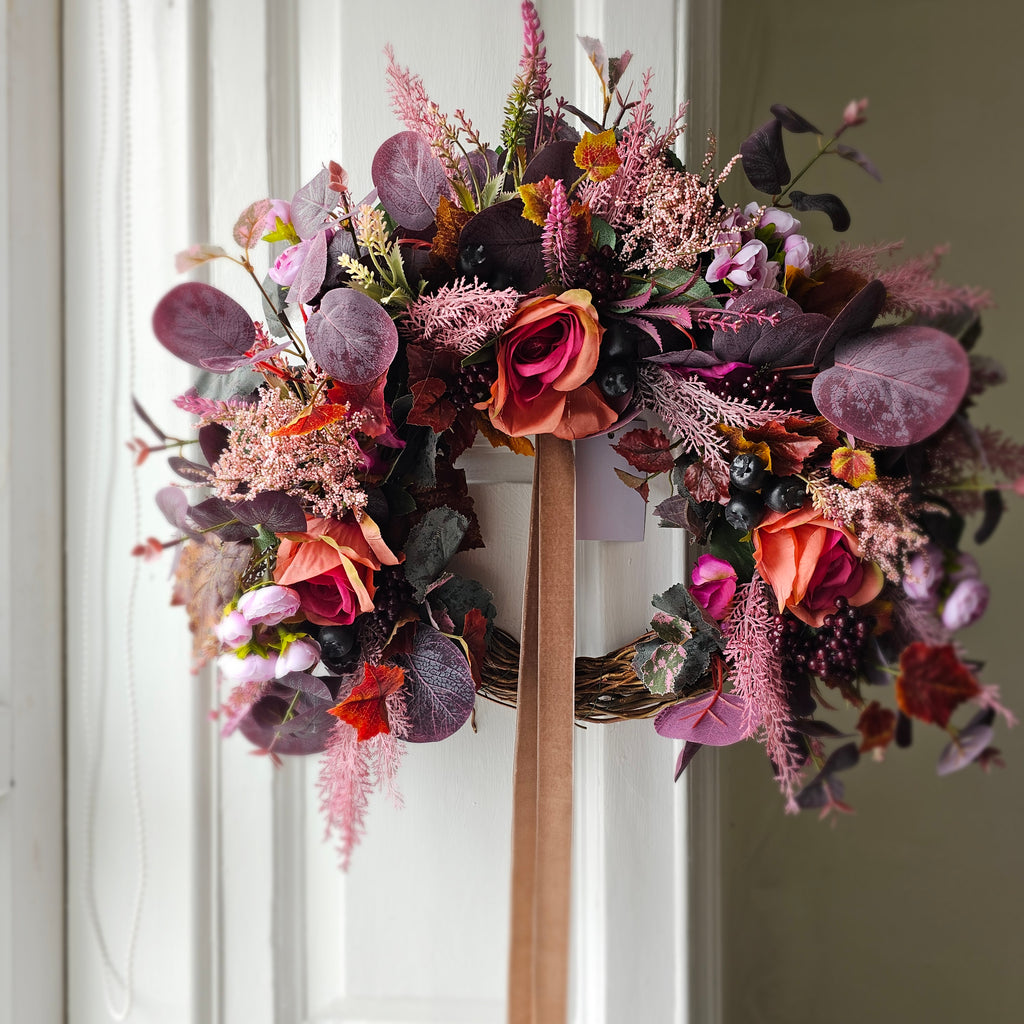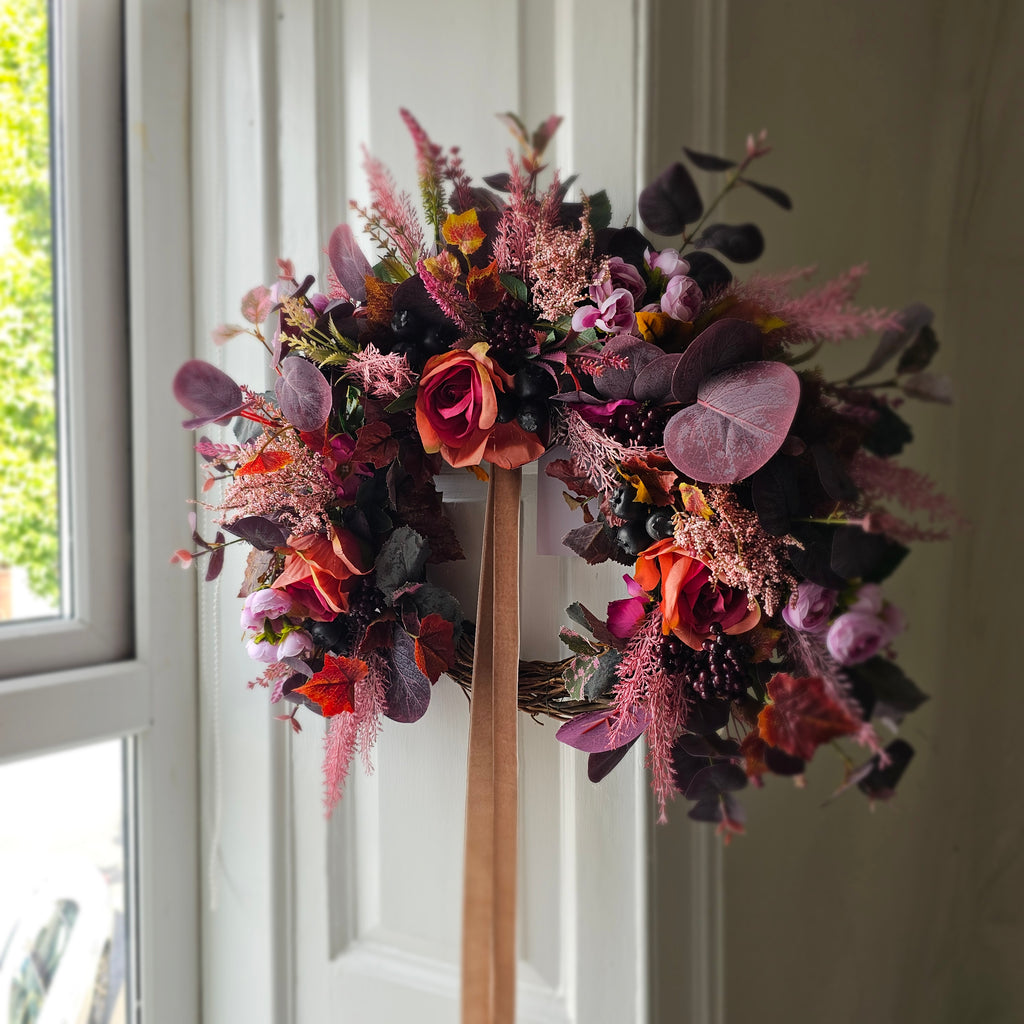 A stunning cresent wreath full of burgundy eucalyptus, roses, heathers and other autumnal foliage. Finished with a blush velvet ribbon. Handcrafted the foliage extends out to approx 55cm.
