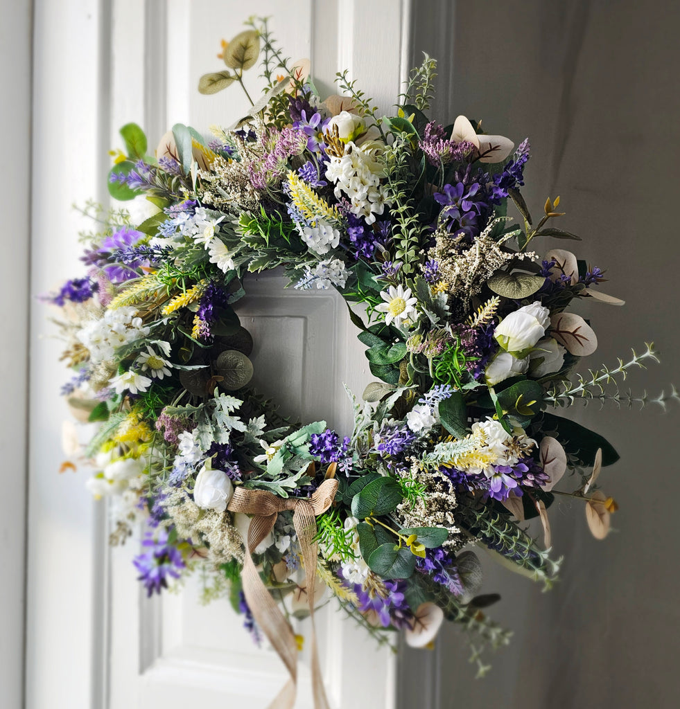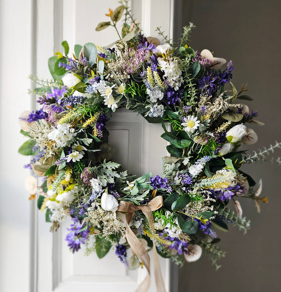 A beautiful organic looking wreath full of faux florals and foliage finished with a burlap bow. Handcrafted, the foliage extends out to approx 55cm from tips.