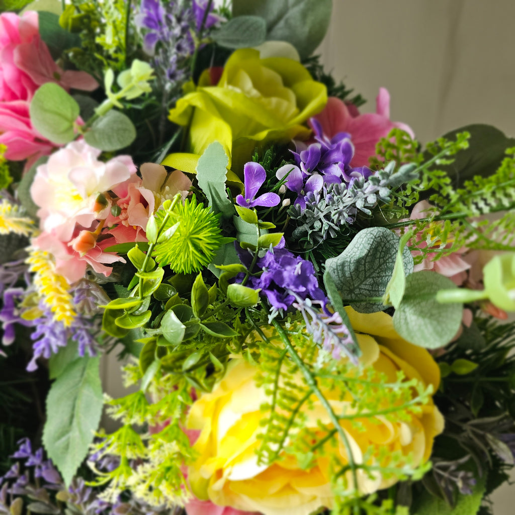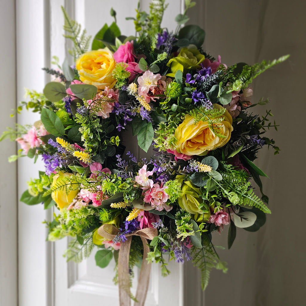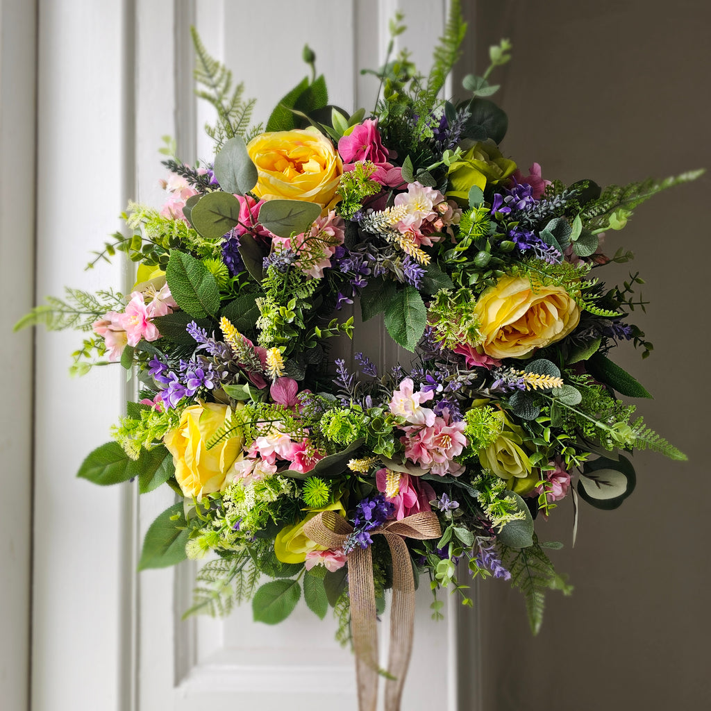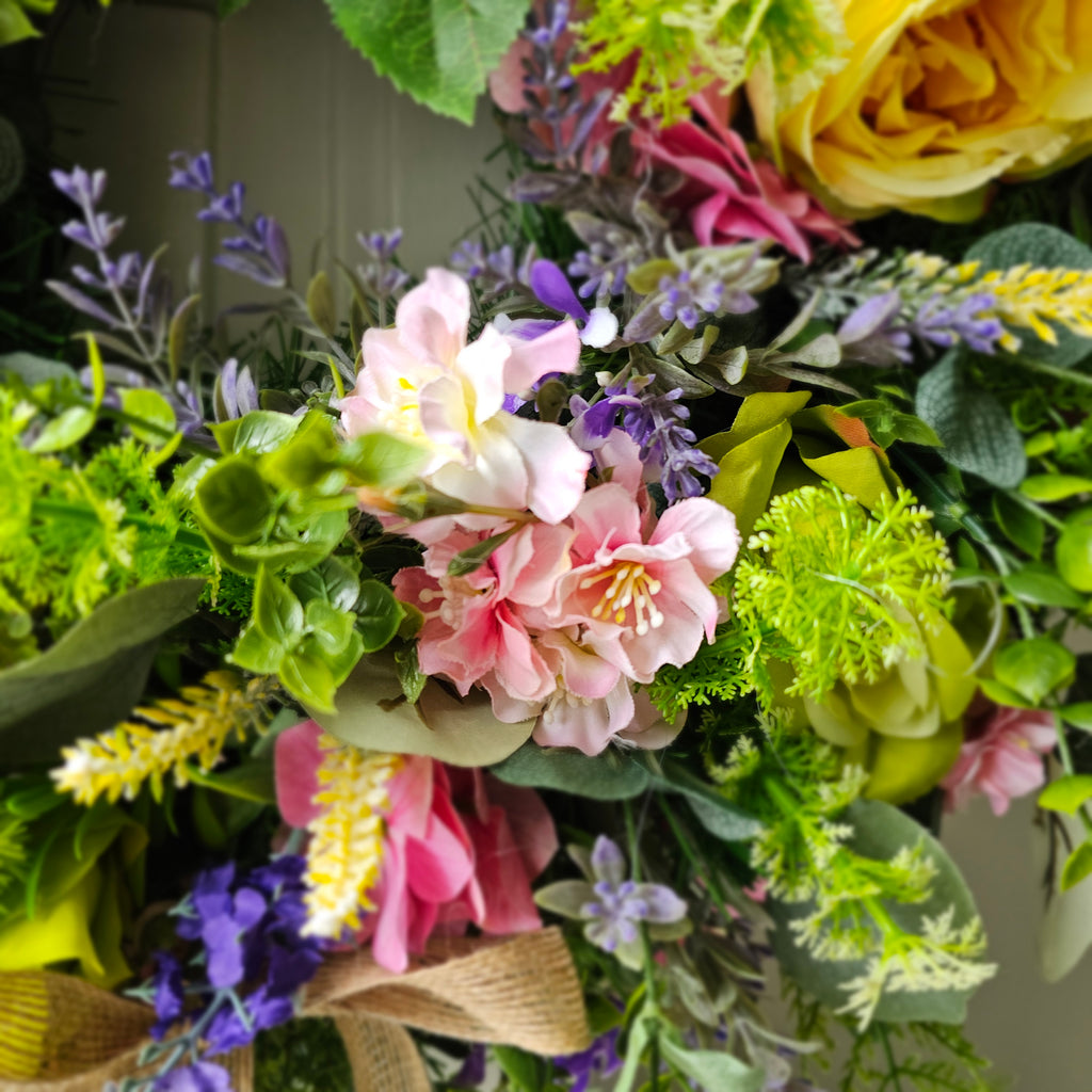 A bright and vibrant wreath full of stunning faux florals and foliage finished with a burlap bow. Handcrafted the foliage extends out to approx 55cm from tips.