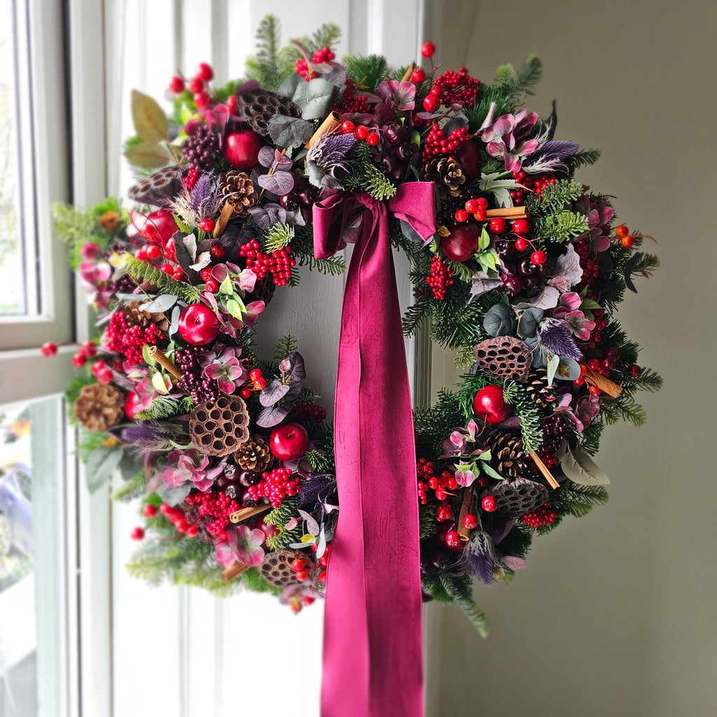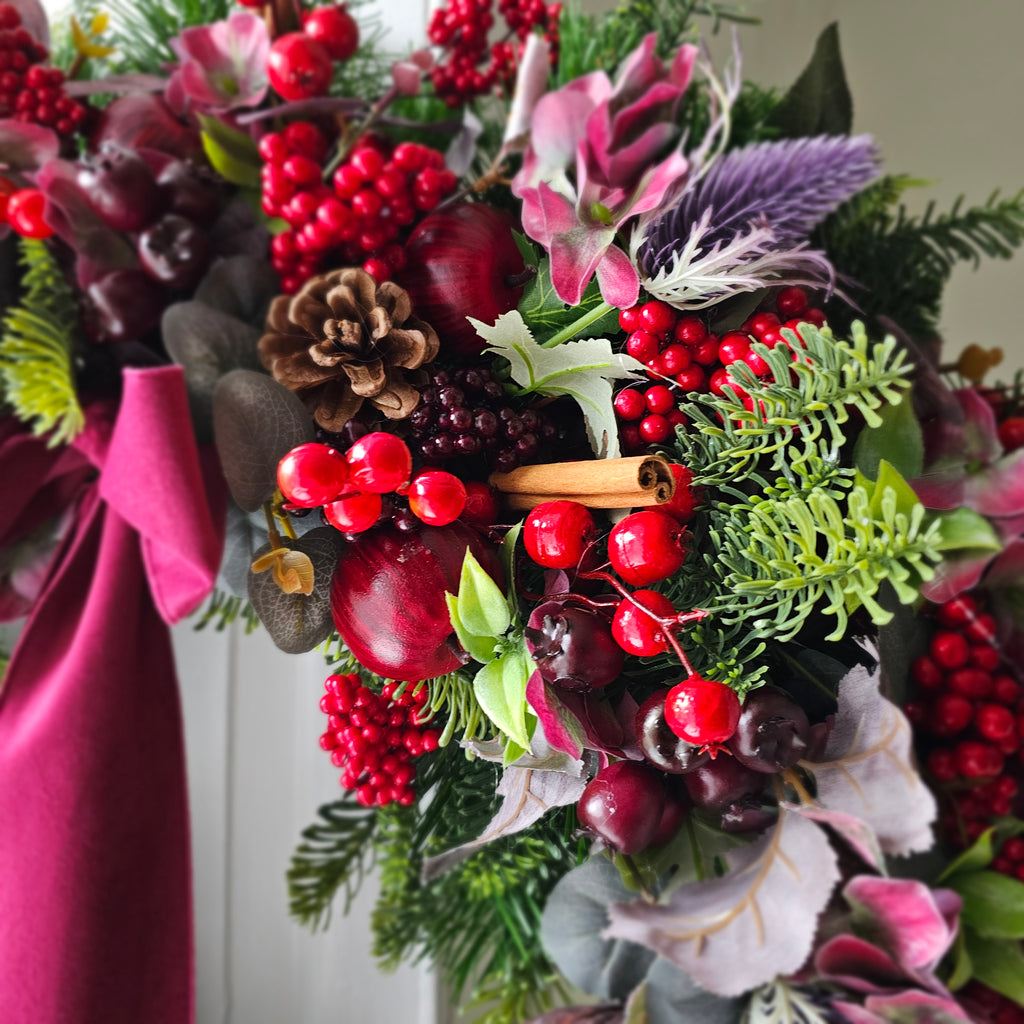 An absolute showstopper the deluxe winter Feast wreath is perfect for large walls, grand entrances or a statement piece in your home. Full of faux winter foliage, apples, berries, pinecones, lotus pods and cinnamon sticks all finished with a lush velvet box. Handcrafted and measuring approx 80cm from tips of foliage it a stunning addition to your festive decor. Please allow 7-10 days for dispatch.