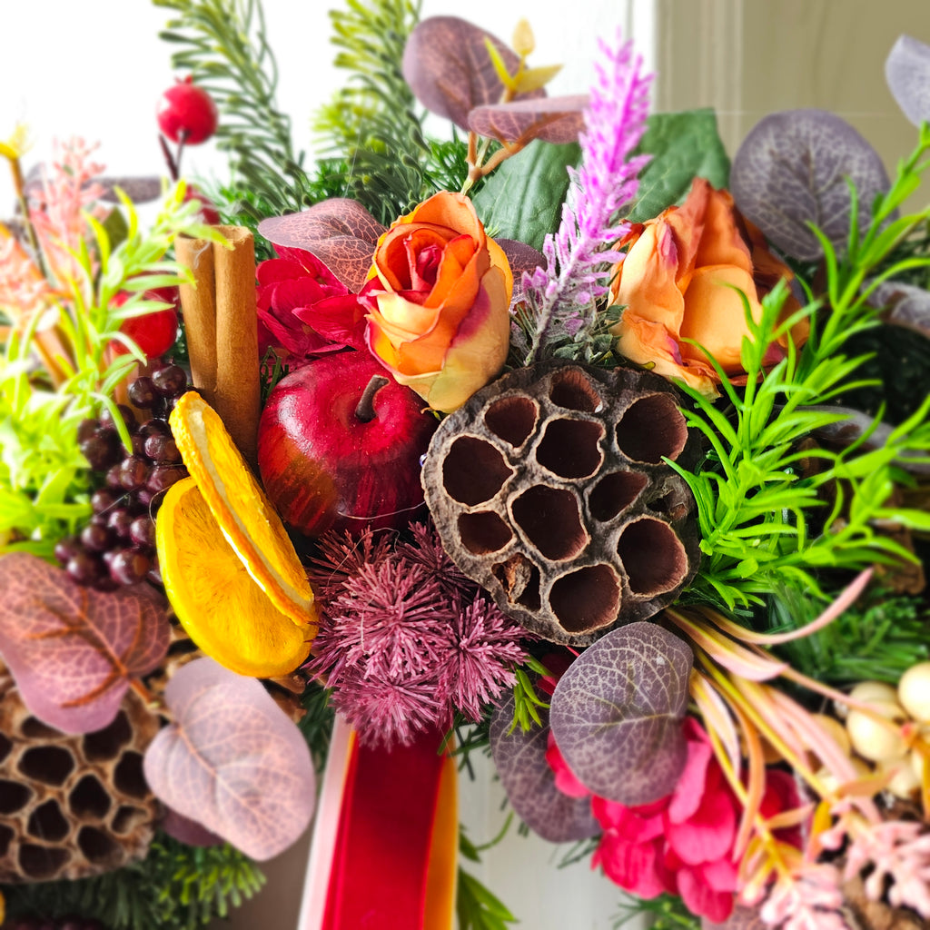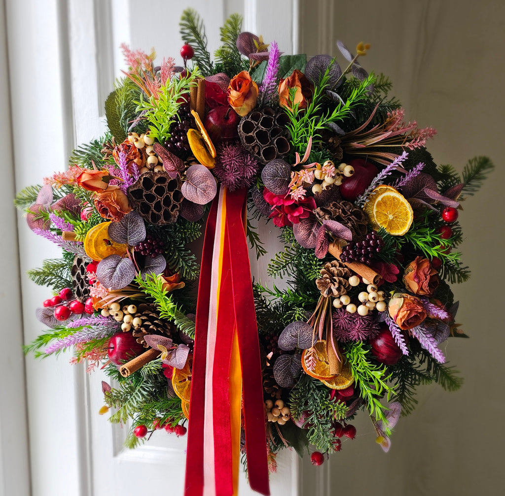 A stunning festive bright wreath full of faux florals and winter foliage, pincones, cinnamon sticks, dried orange slices, faux apples, berries and lots more. Finished with masses vibrant lush velvet ribbons, its a perfect pop of colour for your festive decor. Handcrafted the foliage extends out to approx 60cm. Please allow 7- 10 days for dispatch. Due to the addition of the dried orange slices, this wreath is best suited to indoors or a very sheltered door.