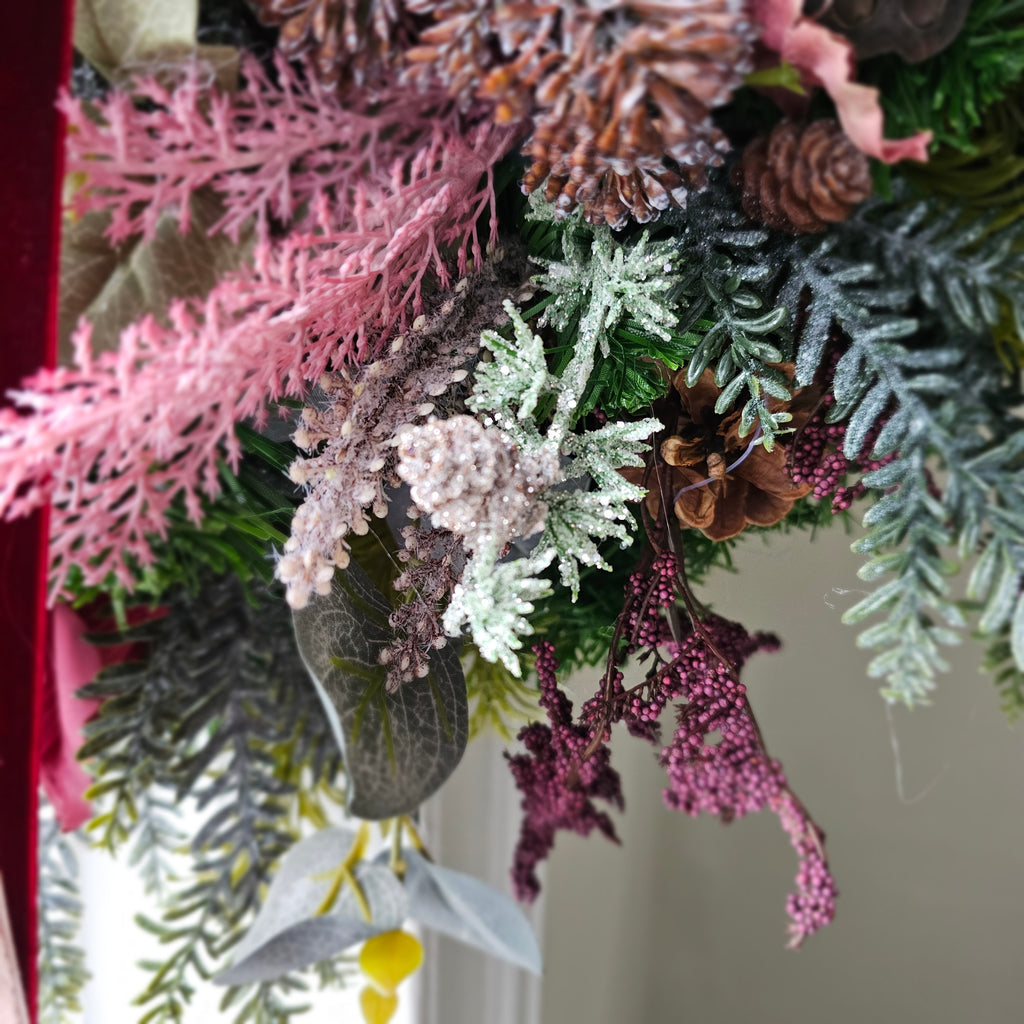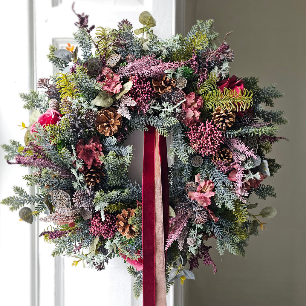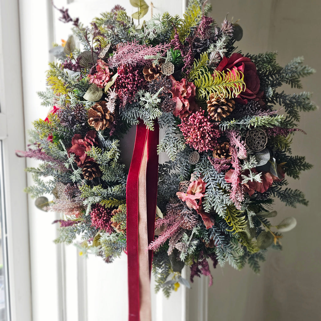 Winter's Whisper is an elegant understated Wreath full of faux winter foliage, stunning red roses, pinecones, mini lotus pods and much more. Finished with luxurious velvet ribbon. Handcrafted, the foliage extends out to approx 60cm. Ready for dispatch.this week.