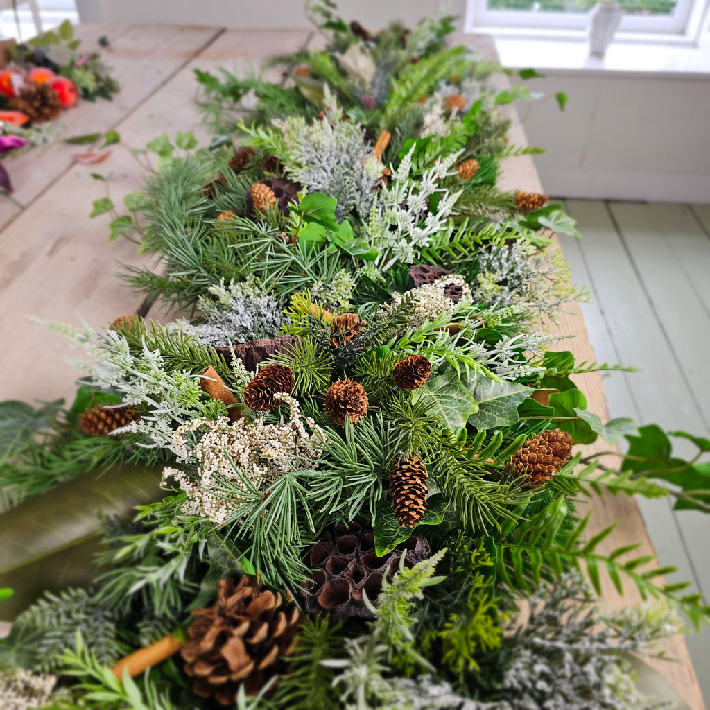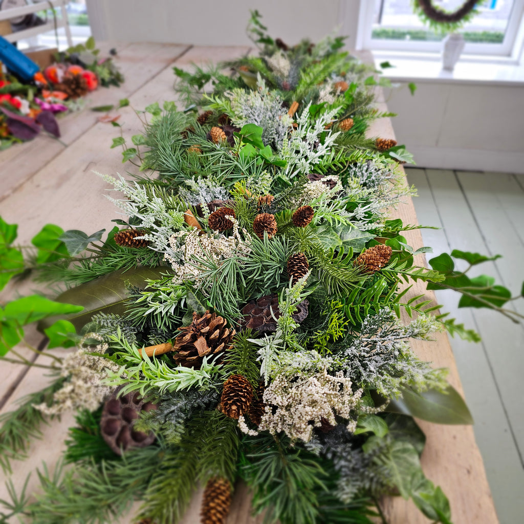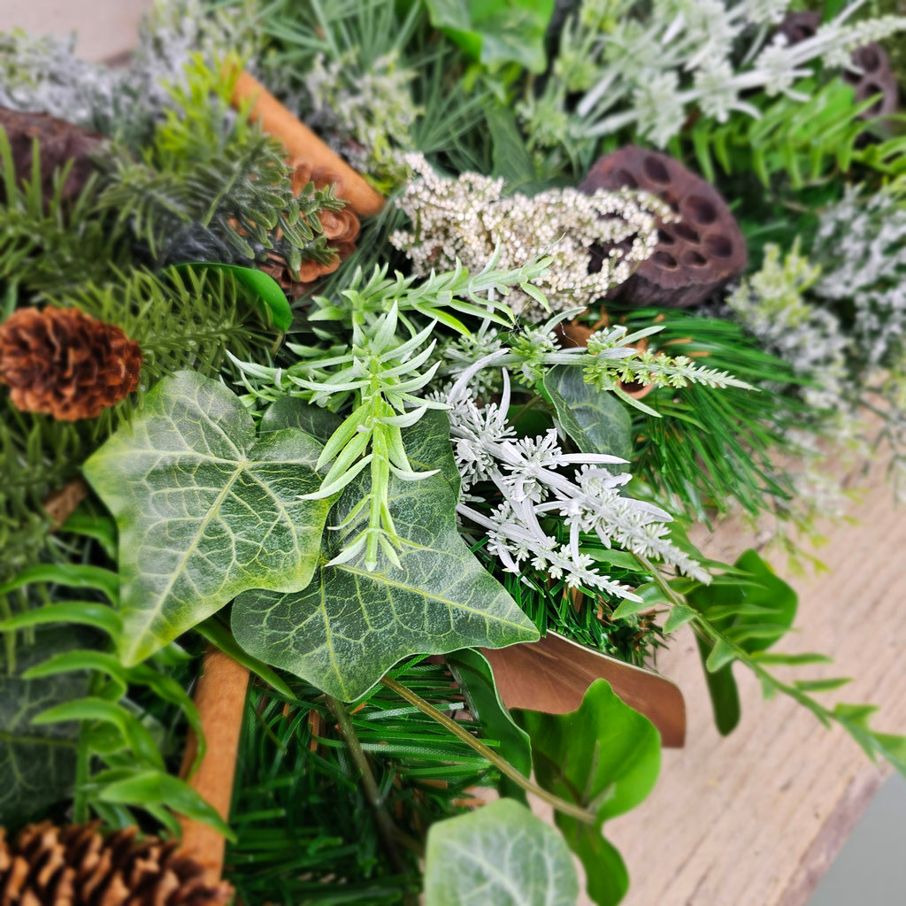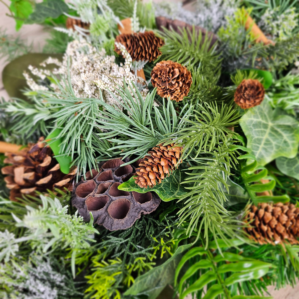 A beautiful natural garland full of faux pine, eucalyptus, ivy, fir, pinecones, lotus pods, cinnamon sticks and lot more. Measures approx 120cm. Allow 10 -14 days for dispatch