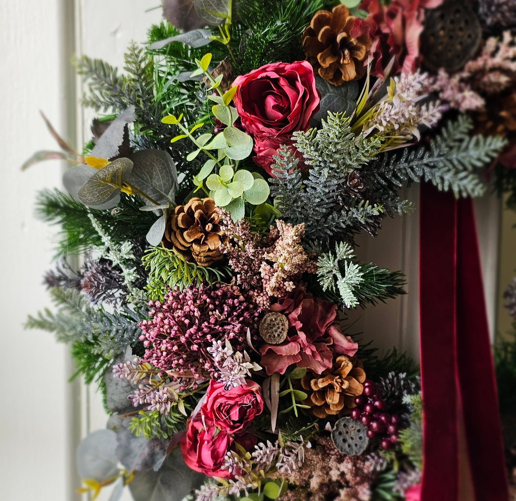 Winter's Embrace is an elegant understated Wreath full of faux winter foliage, stunning rustic red roses, pinecones, mini lotus pods and much more. Finished with luxurious velvet ribbon. Handcrafted, the foliage extends out to approx 60cm. Allow 10 -14 days for dispatch.